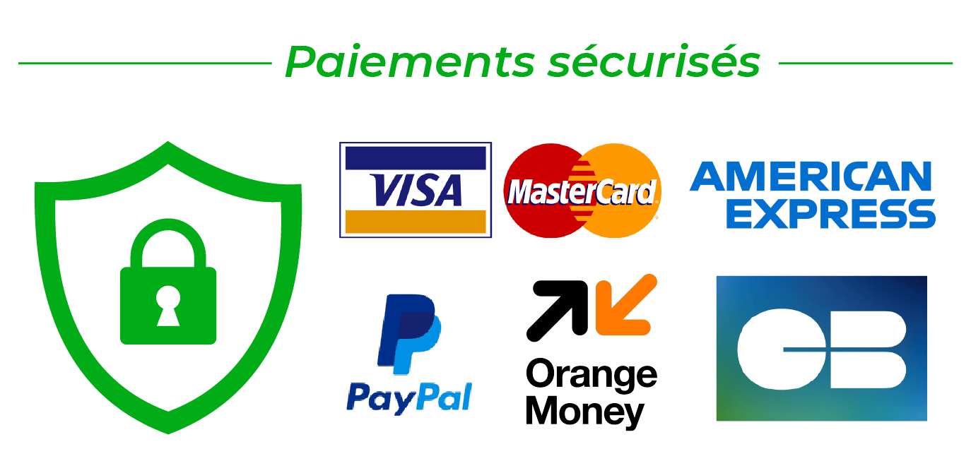 Nous avons choisi de confier la gestion de nos paiements en ligne à Stripe & Paypal; Nous avons aussi mis à votre disposition le paiement par Orange Money pour les locaux des pays de la CEDEAO grâce à leurs services 100% Sécurisés.